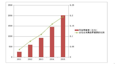 图1 全市网络零售额及其占社会消费品零售额的比例(2011-2015)