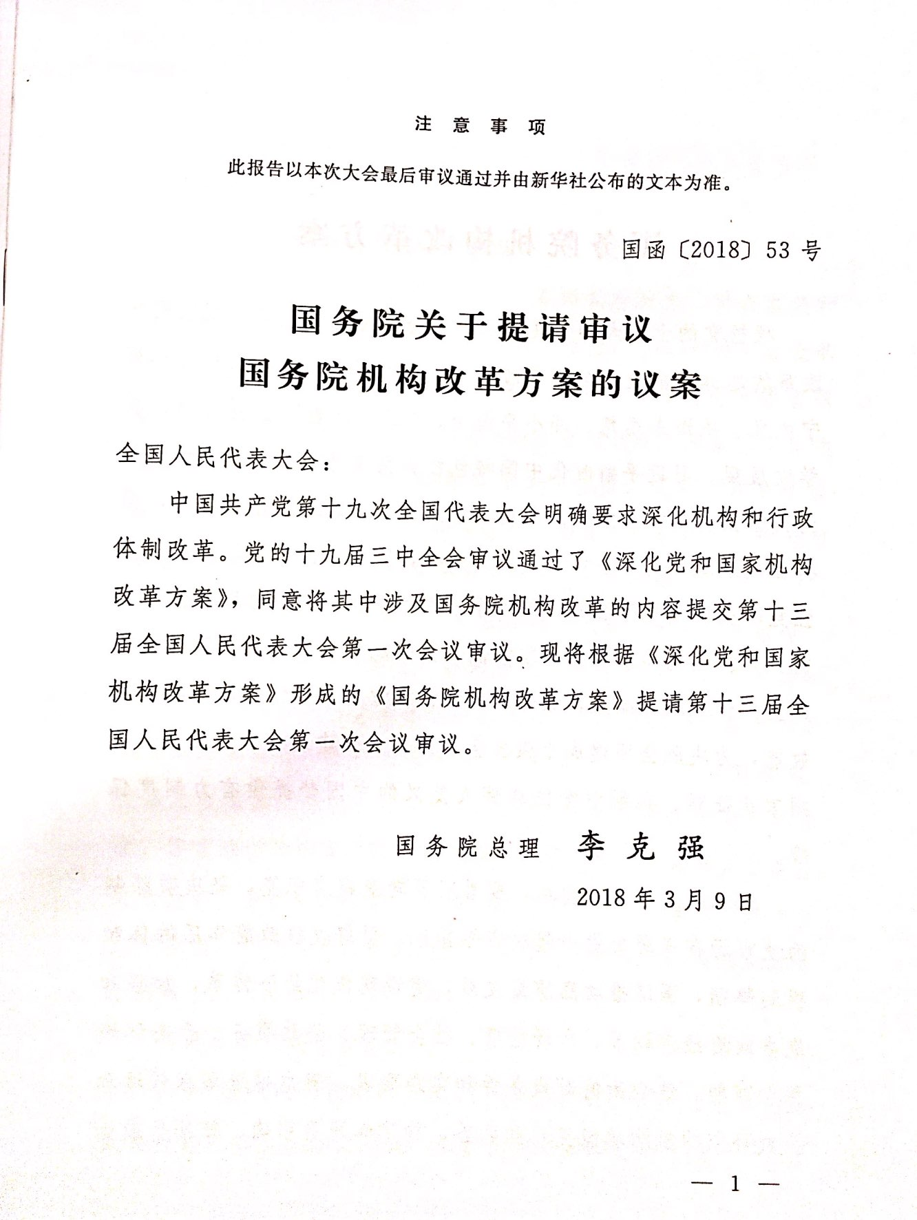 国务院机构改革方案的议案